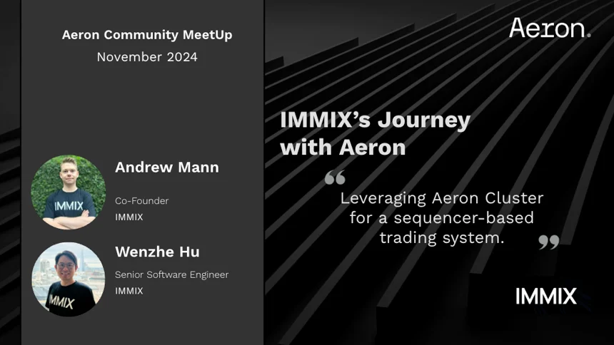 IMMIX is a pioneer in developing high-performance trading infrastructure for digital assets. At our Aeron MeetUp held in London in November 2024, Wenzhe Hu, Senior Software Engineer, and Andrew Mann, Co-Founder at IMMIX, shared their sequencer journey with Aeron. This blog post summarizes their talk, highlighting key points and inviting you to watch the full presentation for a deeper dive into architecture and benchmark data.